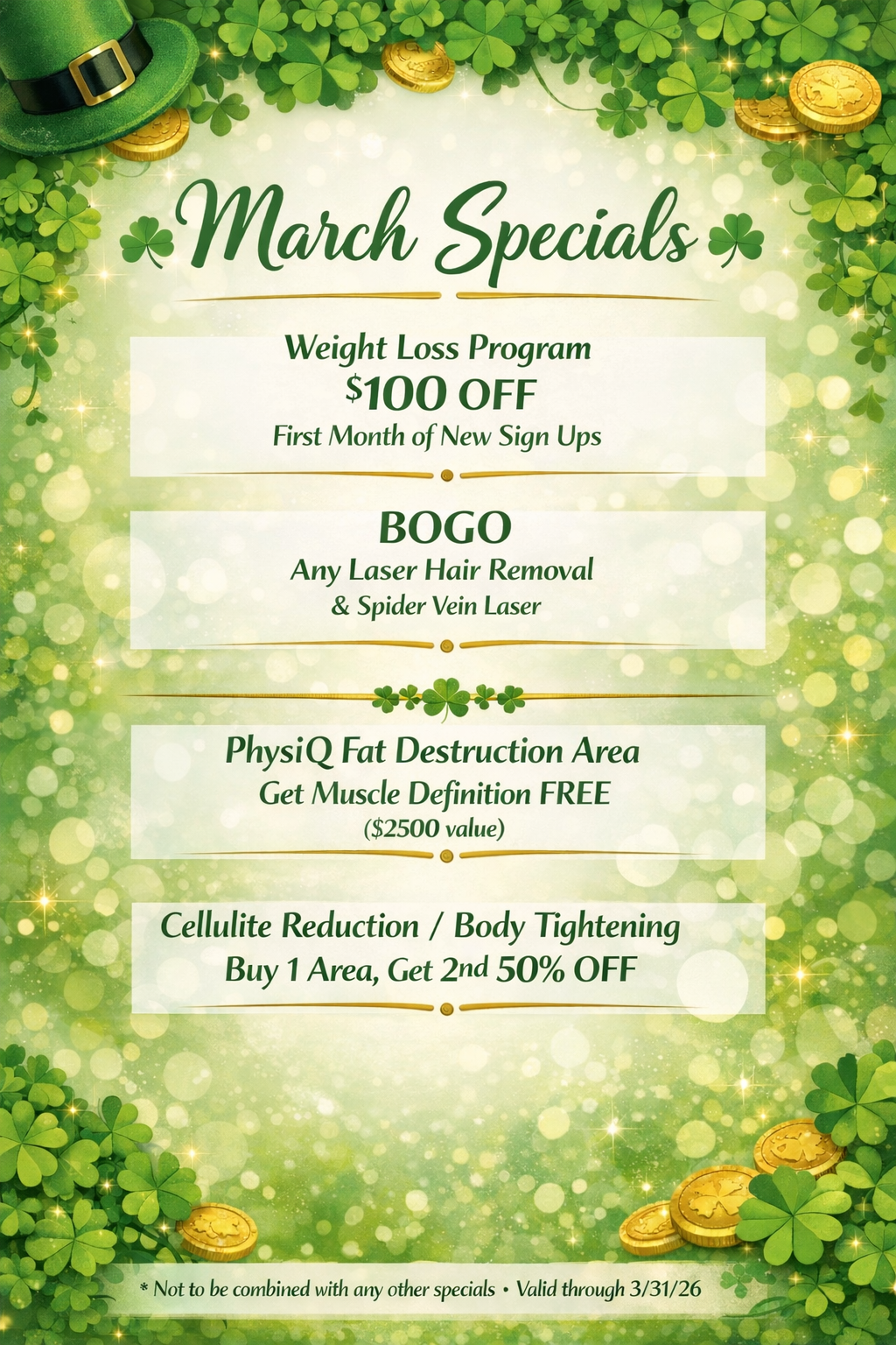 Whether you’re looking for medical weight management, laser hair removal, body contouring, cellulite reduction, or muscle definition, our March promotions make high-level aesthetic treatments more accessible than ever.